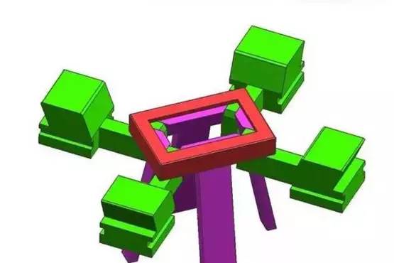 碰到此類(lèi)產(chǎn)品,我們首先會(huì)考慮能不能做斜頂,但通過(guò)分析,做斜頂4個(gè)角落位置的倒扣無(wú)法脫離(箭頭方向做斜頂) 2.方案 斜頂無(wú)法完全脫倒扣,我們只能考慮能否用斜頂+內(nèi)滑塊的方式進(jìn)行設(shè)計(jì)。如下圖所示,綠色部件為內(nèi)滑塊,粉紅色部件為斜頂。