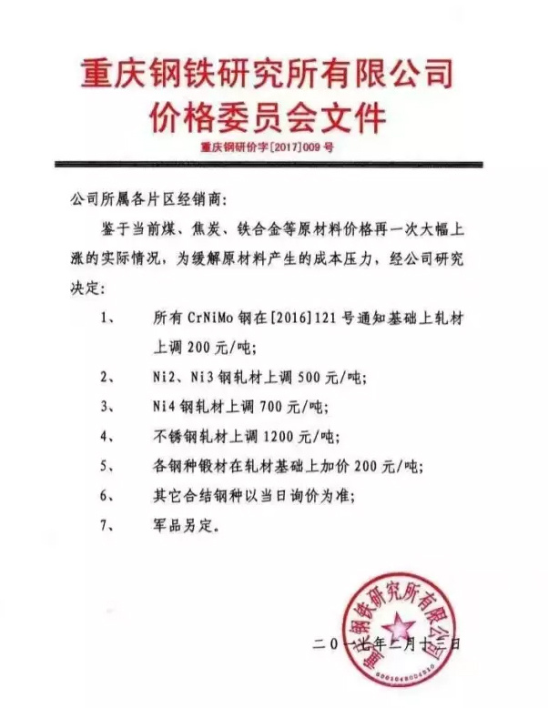 2017年2月20日起,齊魯特鋼有限公司生產的所有鍛造產品,在原價格基礎上統一上調200元/噸